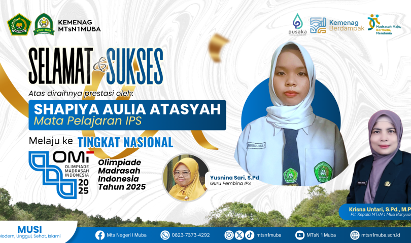 Sekayu (Kemenag Sumsel) — Kabar membanggakan kembali datang di MTsN 1 Musi Banyuasin. Salah satu perwakilan madrasah, Shapiya Aulia Atasyah, peserta didik kelas IX, berhasil melaju ke tingkat nasional Olimpiade Madrasah Indonesia (OMI) Tahun 2025 pada bidang Ilmu Pengetahuan Sosial (IPS). Pengumuman resmi keberhasilan ini disampaikan melalui laman resmi OMI pada Jumat (10/10/2025).